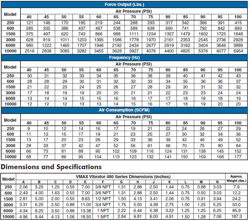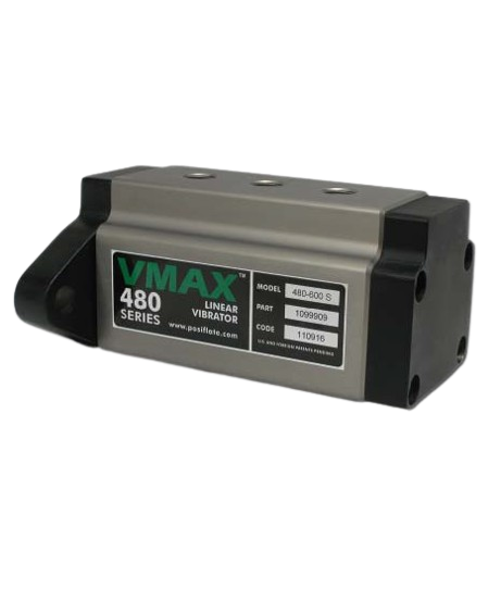 The VMAX™ vibrator is suitable for many different applications, including vibratory conveying, vibratory compacting and discharging of either dry or wet difficult to handle bulk solids from bins and hoppers. The VMAX™ linear vibrator is versatile with regard to most applications because its force output can be adjusted for a wide range of requirements by simply increasing the compressed air pressure and/or volume using conventional low cost air or electrical controls. The flexibility and range of the VMAX™ linear vibrator can be enhanced considerably by utilizing a two mass design, where the output force can be multiplied numerous times its normal maximum output. The VMAX™ linear vibrator can also be used to compact materials when filling containers to achieve maximum space utilization and save shipping costs. When designed into a vibratory conveyor for instance, the VMAX™ linear vibrator has tremendous cost and performance advantages over using an electric vibrating motor for the drive mechanism. This is because the VMAX™ linear vibrator starts and stops quickly and smoothly and is more controlled for significantly better performance. It does not go through a violent resonance phase like an electric vibrating motor. When an electric vibrating motor starts and/or stops, it goes through what is called a resonance phase, where the frequency of the vibrating system is at the natural frequency of the suspension. When this happens, amplification of movement occurs and the conveyor reacts violently. In addition, this violent movement takes some time to settle down and fully stop, which is not only detrimental for many applications, but can be costly to resolve as well. Also, because the VMAX™ linear vibrator operates with compressed air, it is a natural for explosion proof applications and much safer to use. When used with filtered and lubricated compressed air, the VMAX™ linear vibrator requires only minimal maintenance. |